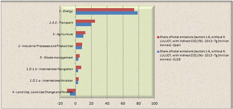 Las emisiones de gases de efecto invernadero en España, podemos decir que sectorialmente supera en el sector de transporte (internacional y nacional, marítimo, terrestre y aéreo), la industria, la gestión de residuos y el agrícola a la media Europea. El sector forestal, presenta los dos casos, valores negativos, que en nuestro país en valor absoluto tiene una mayor magnitud, lo que nos indica una clara tendencia favorable a nuestro territorio en cuanto al impacto ambiental de estos contaminantes debido a las actuaciones de la hombre en las masas forestales. Sólo el sector Energético las emisiones europeas tiene unos valores por encima en nuestro país (4 puntos).